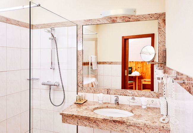 Comfy single room with queen-size bed, south balcony, shower, WC, hairdryer, beauty products, bathrobe, flatscreen satellite-TV, telephone.